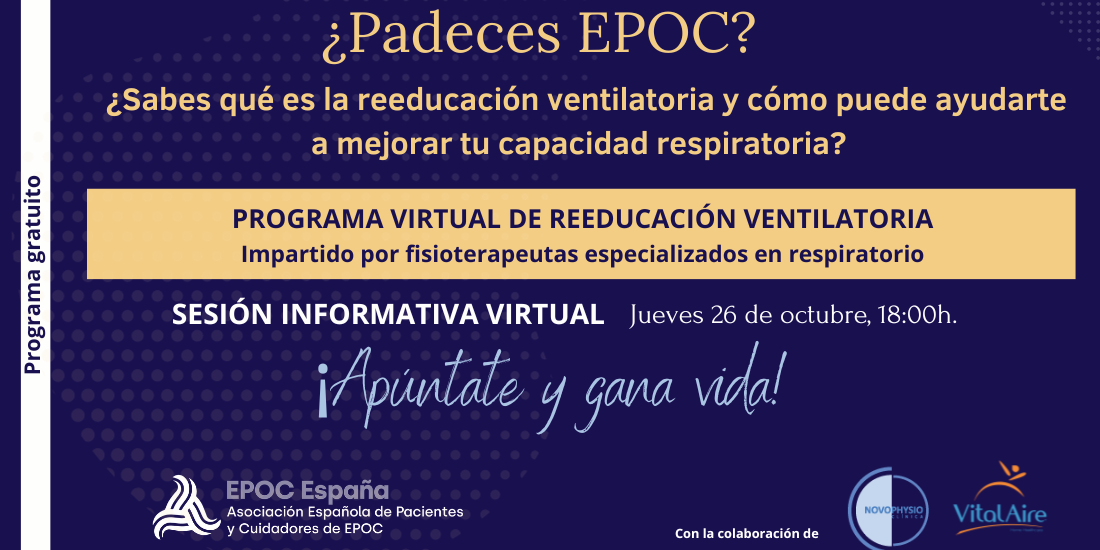 EPOC España pone en marcha este mes de octubre un Programa virtual de Reeducación Ventilatoria destinado a pacientes con EPOC con el que se pretende formar a los afectados sobre temas generales de la patología y mejorar la salud, la gestión de la disnea y la autonomía y desempeño personal. El programa será ejecutado por un equipo de profesionales sanitarios especializados en fisioterapia respiratoria de Novophysio liderado por Alejandro Rodríguez. El programa tiene plazas limitadas y es de acceso gratuito para todos los pacientes con EPOC que deseen participar, con prioridad para los asociados de EPOC España.