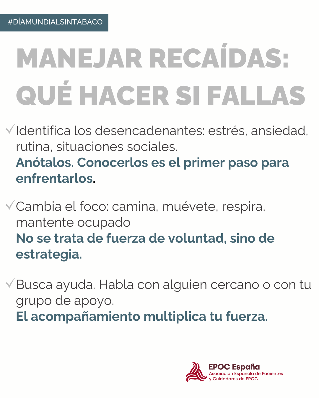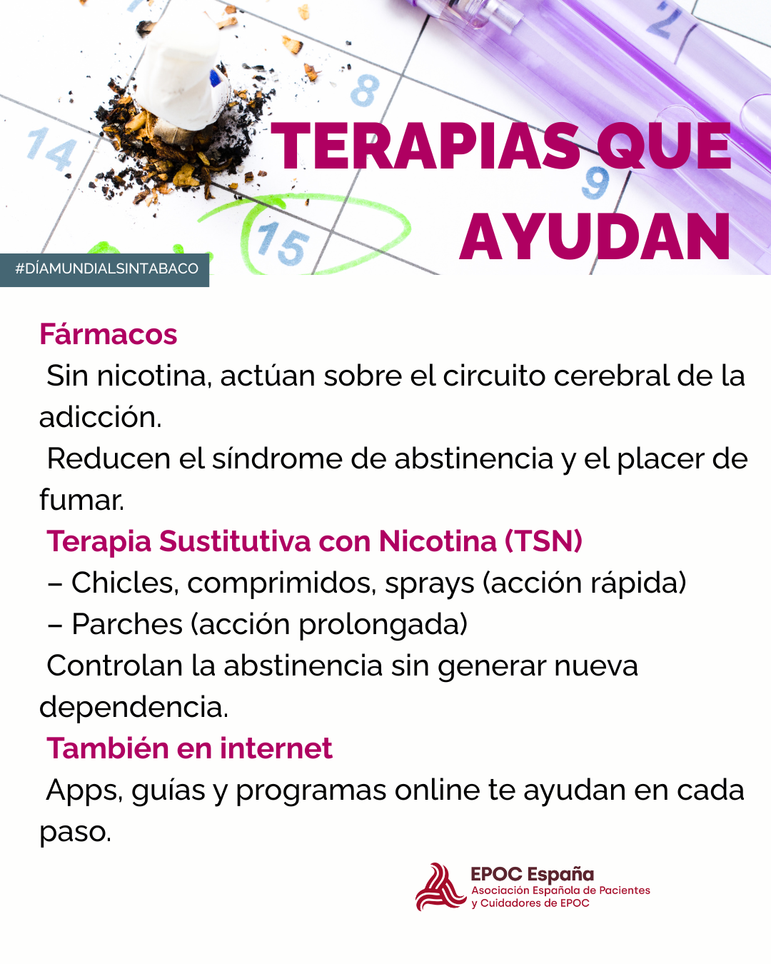 Dejar de fumar sigue siendo el mejor tratamiento para ralentizar la evolución de la EPOC y reducir sus síntomas. El riesgo no se limita sólo a quienes fuman, el humo de segunda mano también afecta a personas no fumadoras y puede provocar EPOC y otras afecciones graves.