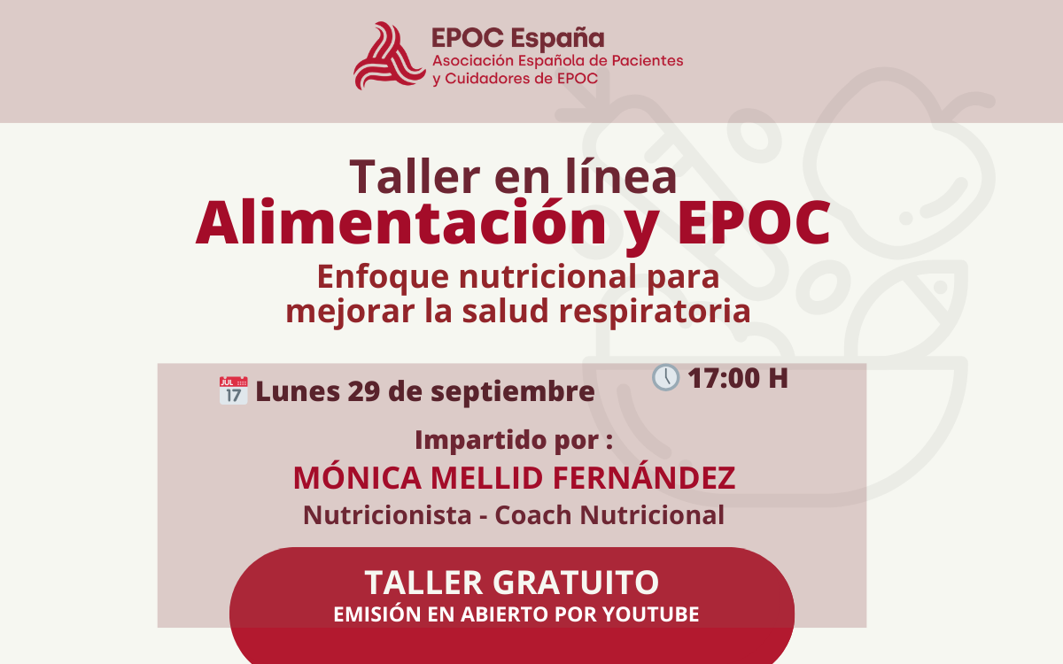 Con este propósito, EPOC España organiza el taller en línea: Alimentación y EPOC, una sesión abierta y gratuita que se podrá seguir por YouTube el lunes 29 de septiembre a las 17:00 horas. La actividad será impartida por Mónica Mellid Fernández, nutricionista y coach nutricional, quien ofrecerá un enfoque práctico sobre la relación entre nutrición y salud respiratoria, además de ofrecer recomendaciones para adaptar la dieta a las necesidades específicas de quienes padecen EPOC.